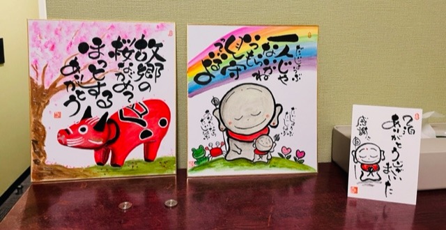 桜と巨大赤べこの色紙が完成!こちらは自分自身の記念として事務所に飾っています☆