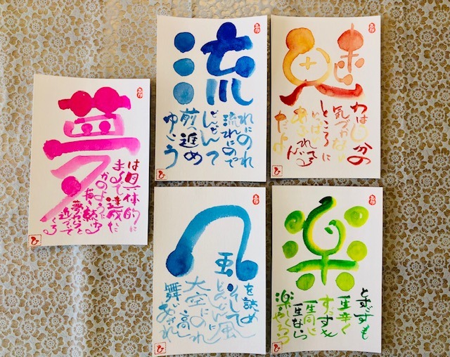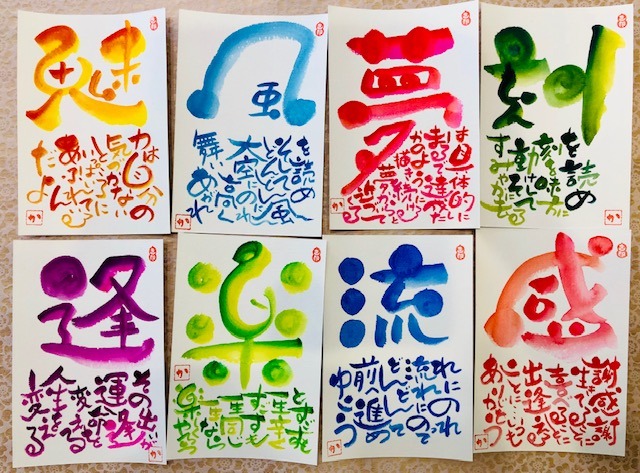 先週土曜日は、己書プライベート幸座を開催。お2人が色文字を書かれました。色文字は、透明水彩絵具と絵具筆を使って書きますが、本当に奇麗ですよね。お2人とも違う感じですが、それぞれの良さが光り、素敵な作品が完成しました。ご参加ありがとうございました。