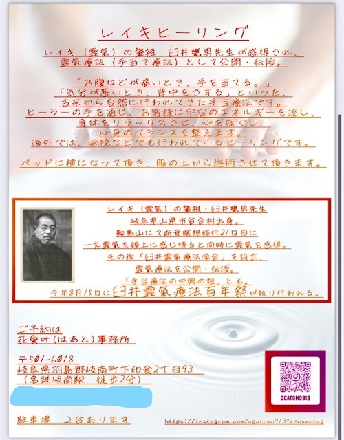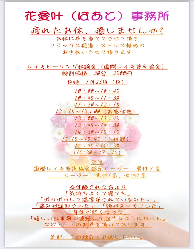 当事務所初の試みです。1月23日(日曜日)にレイキヒーリング体験会を開催させていただきます。当日の担当は、国際レイキ普及協会認定レイキティーチャー1名、レイキティーチャー2名の3名(男性2名、女性1名)で、服の上から手を当てて施術させていただきます。今回は1人30分程度、ベッドが2つあるため、1つの枠に2名様まで、合計最大16名様で募集させていただきます。詳細は写真チラシをご覧ください、体験していただけると、この良さがわかっていただけると思います。ご予約はご質問などは、InstagramのDMもしくはGmailにてお願い致します。愛と癒しの光で満ち足りますように、願いを込めて☆