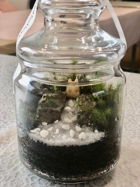 今日は、小学生の女の子がお母さんと一緒に来てくださいました!苔テラリウム、お祖母さんにプレゼントしたいそうです。手作りのものでプレゼント、良いですね!大好きなトトロと小トトロを入れて、素敵な作品が完成しました。お祖母さん、きっと大喜びですね。